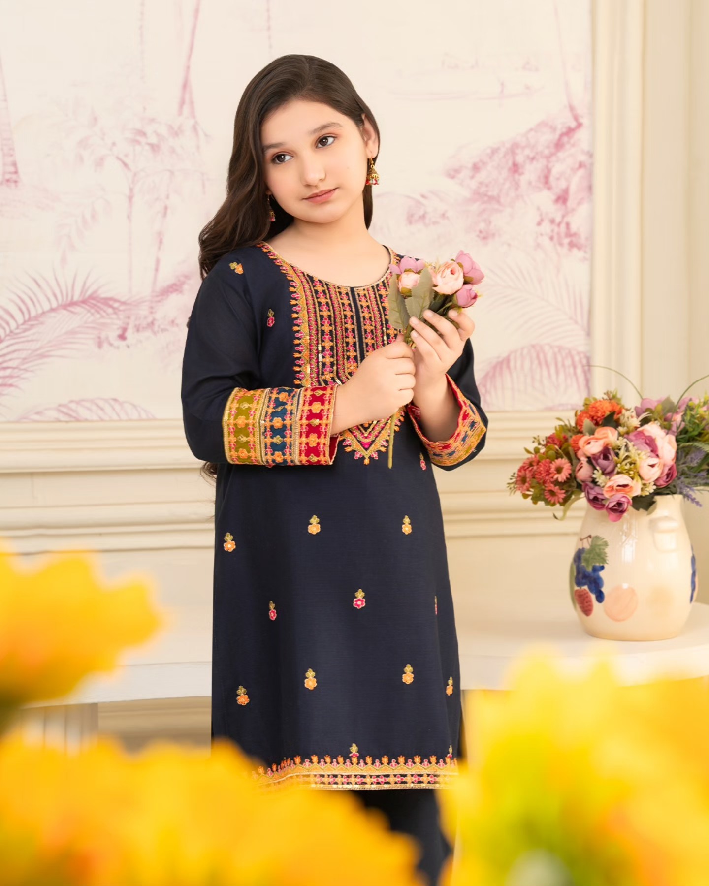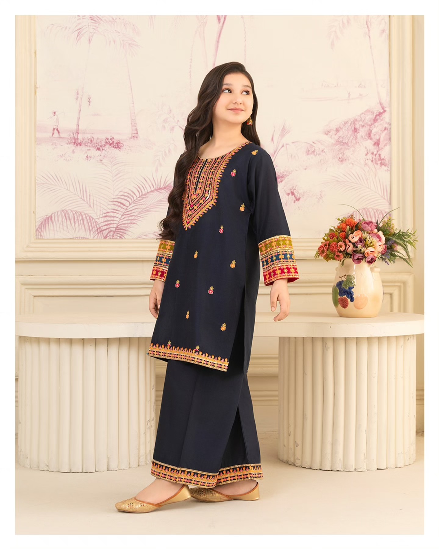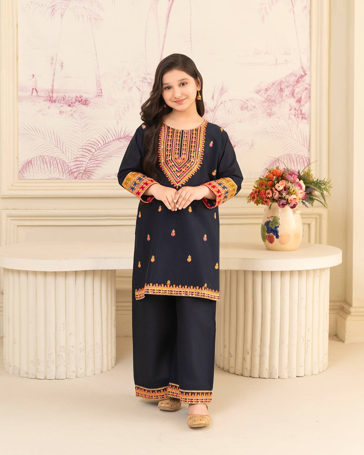 Additional Description: Outfit Type: Eastern Style: Kurta Set Package Includes: 2 Piece-Top & Bottom Fabric:Pure Lawn Color Type: Navy blue Work Technique: Computer Embroidery Trouser: Bell bottom Disclaimer: Actual product color may vary slightly from the image.
